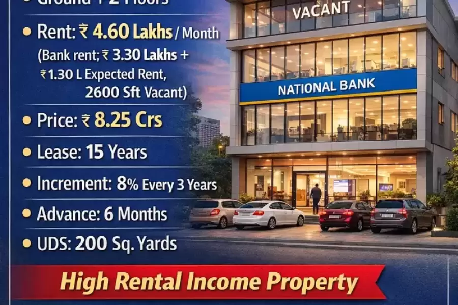 Sale of commercial property with National bank tenant at Banjarahills rd no 1 main road, Area:5400 sft, Ground + 2 floors, Price:8.25 crs,Rent:4.60 lakhs (Bank rent:3.30 lakhs+Rs 1.30 l expected rent, 2600 sft vacant),Lease:15 years,Increment:8% every 3 yrs,Advance:6 months,UDS:200 S.YARDS.